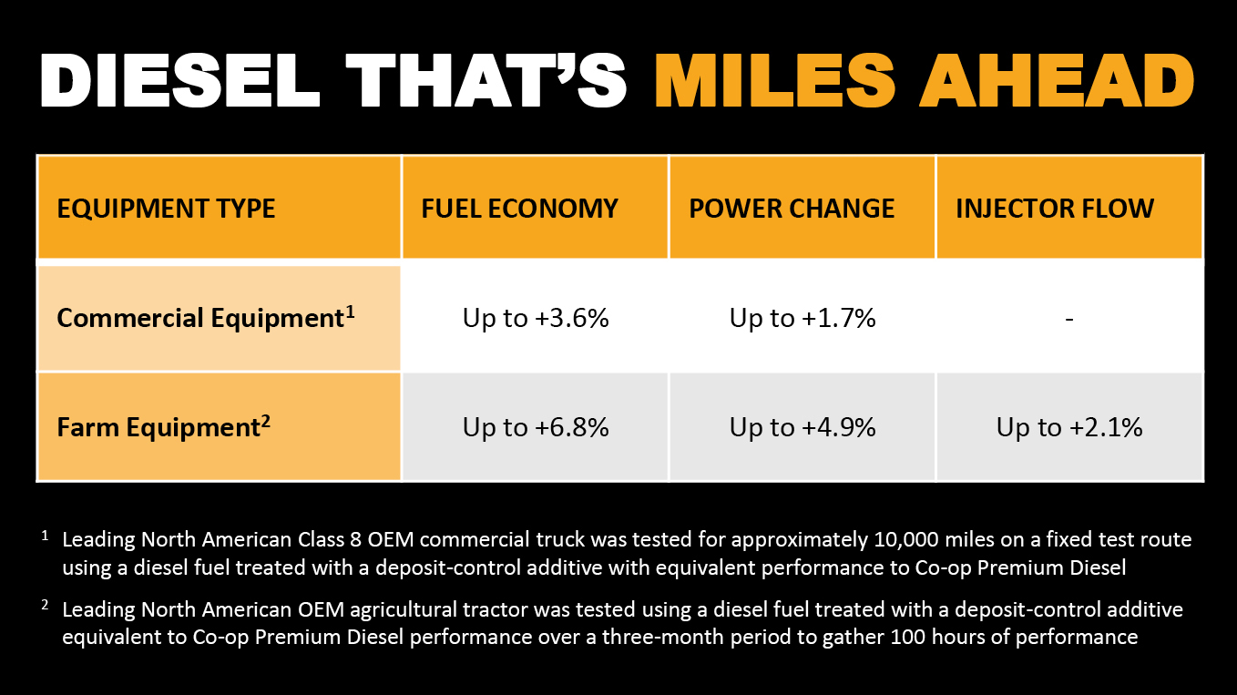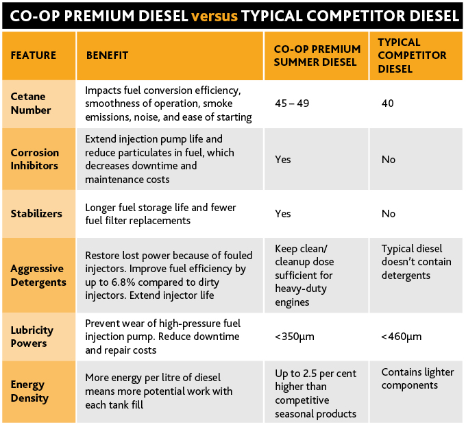 Better yet, when you choose Co-op Premium Diesel, you pay the regular diesel price for a fuel that outperforms the competition. Co-op Premium Diesel guards your equipment thanks to its powerful package of additives and detergents. That means fewer expensive repairs and less unnecessary downtime, no matter what industry you’re in.